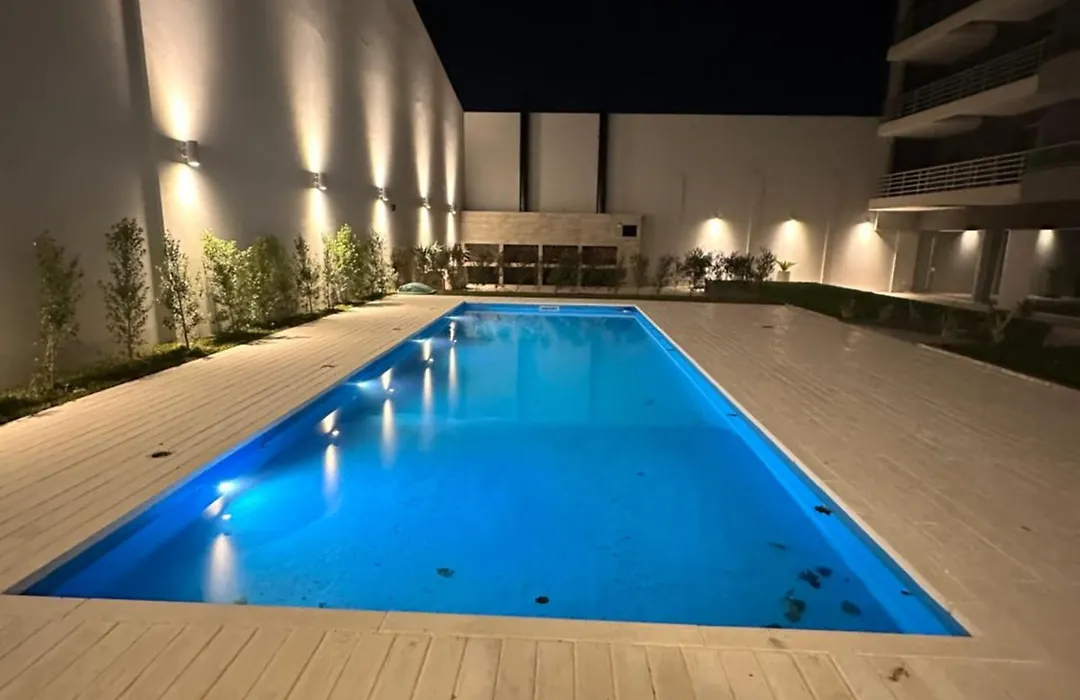The apartment offers a living room and a fully equipped kitchen, as well as comforts like climate control.